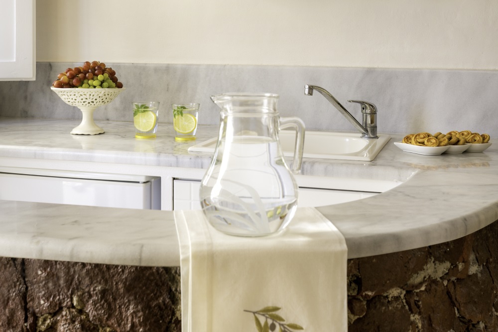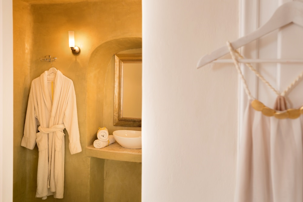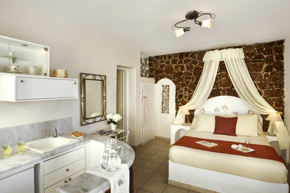 Our studio include a bedroom with a steel or built double bed, a kitchenette and a private bathroom with shower. The balconies have access to the hotel’s large patio with a small pool with view to the Caldera, the Aegean sea & the sunset.